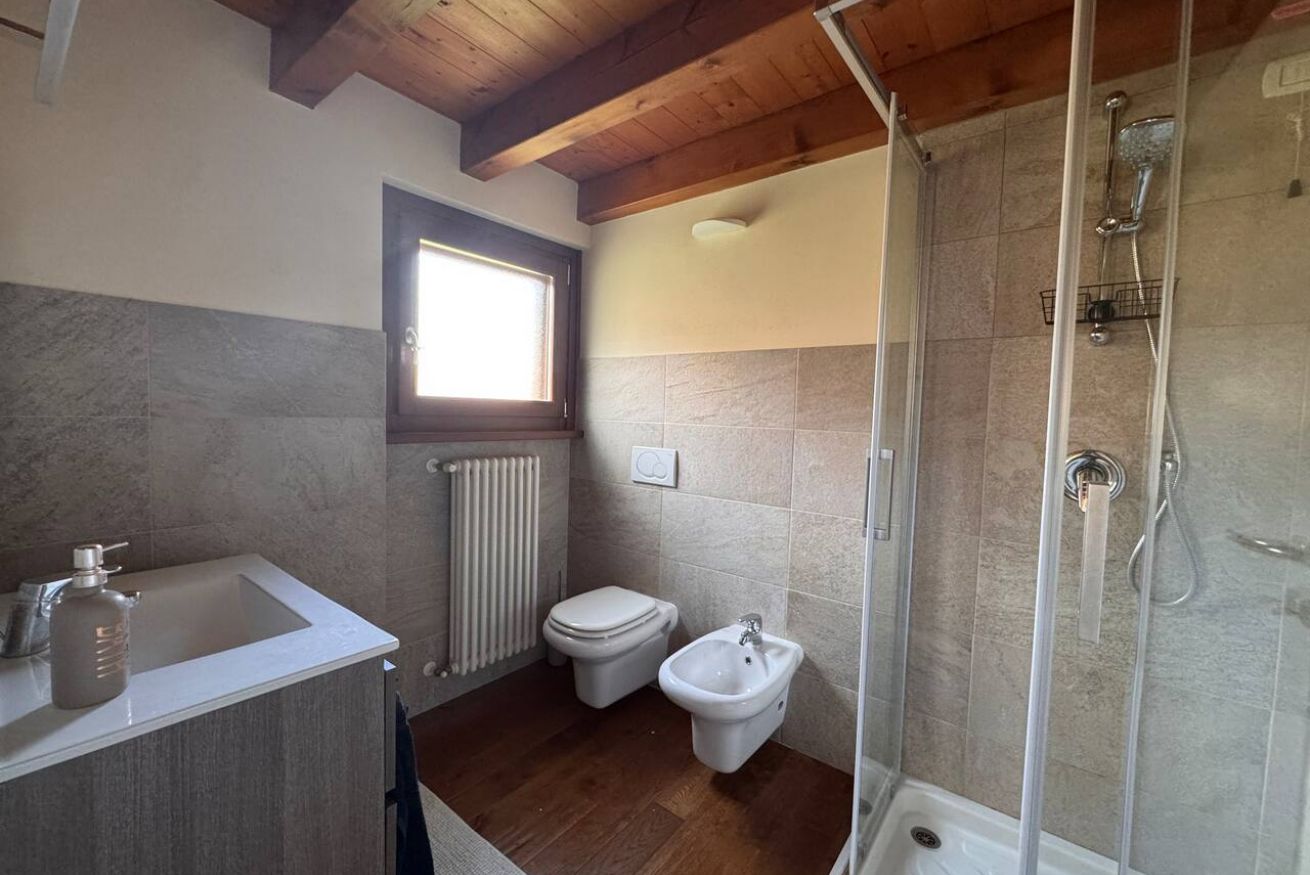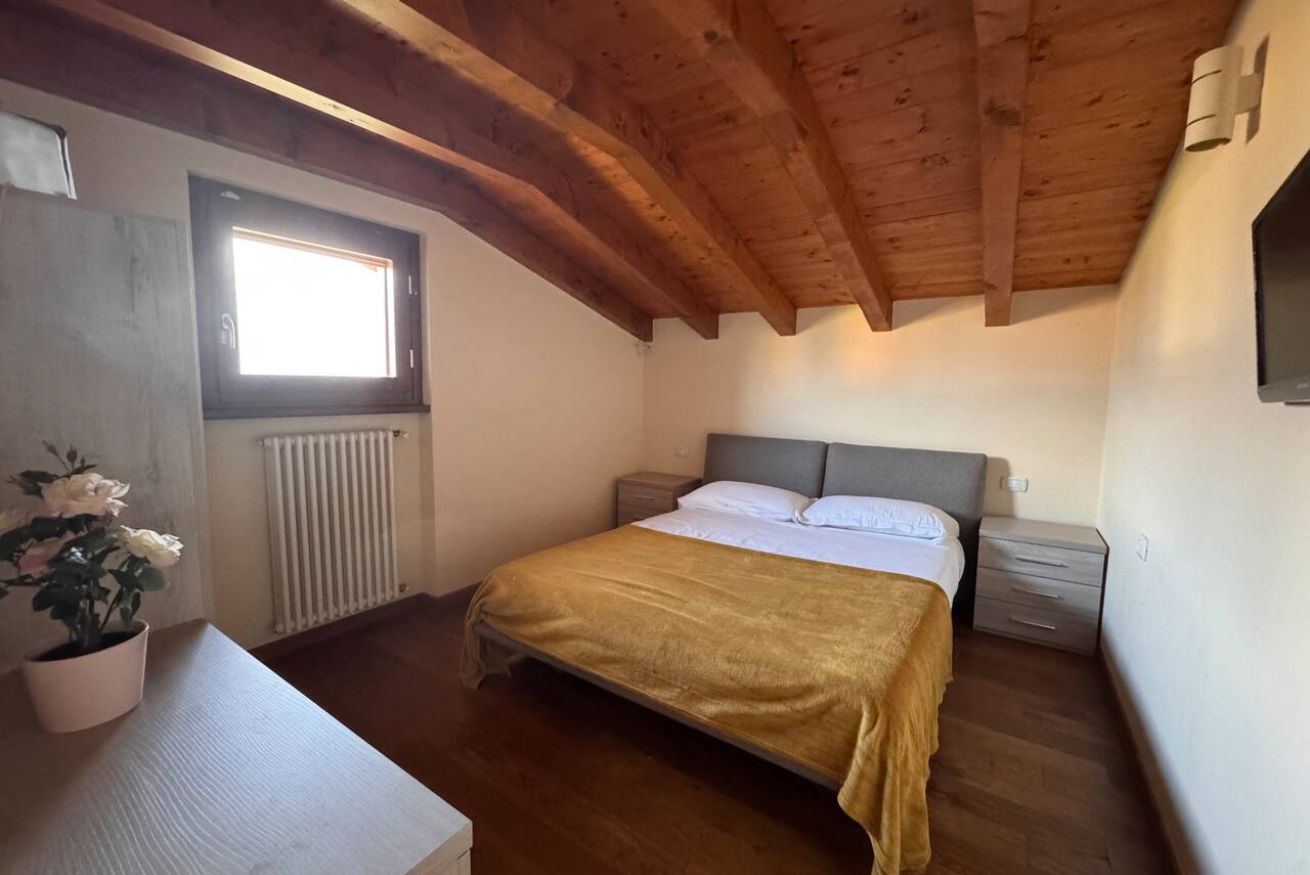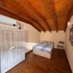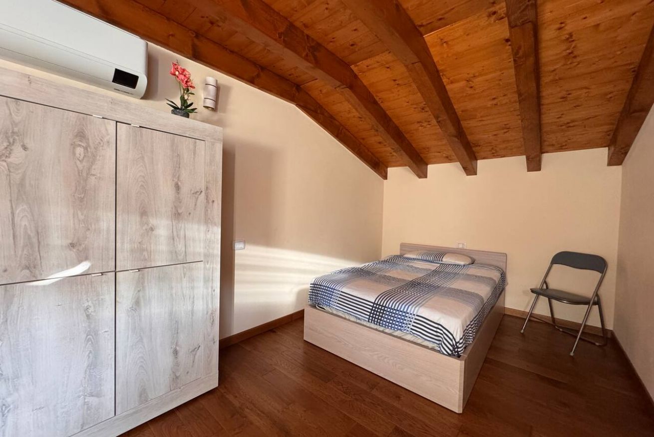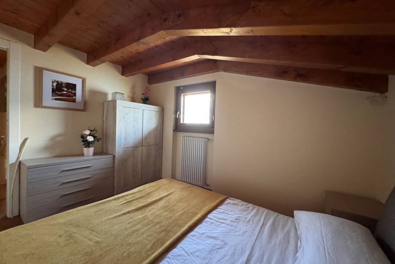 Al piano superiore, caratterizzato da calde travi in legno a vista, si trovano una seconda camera matrimoniale, una camera singola e un secondo bagno, creando una distribuzione ideale anche per famiglie o piccoli gruppi.