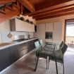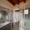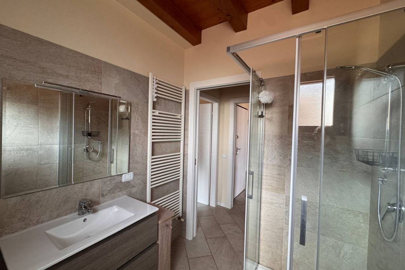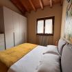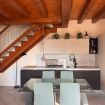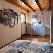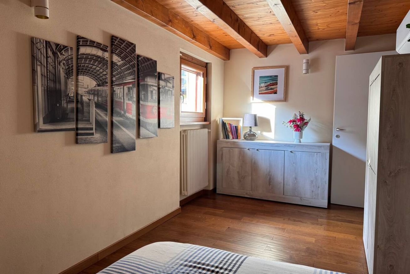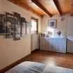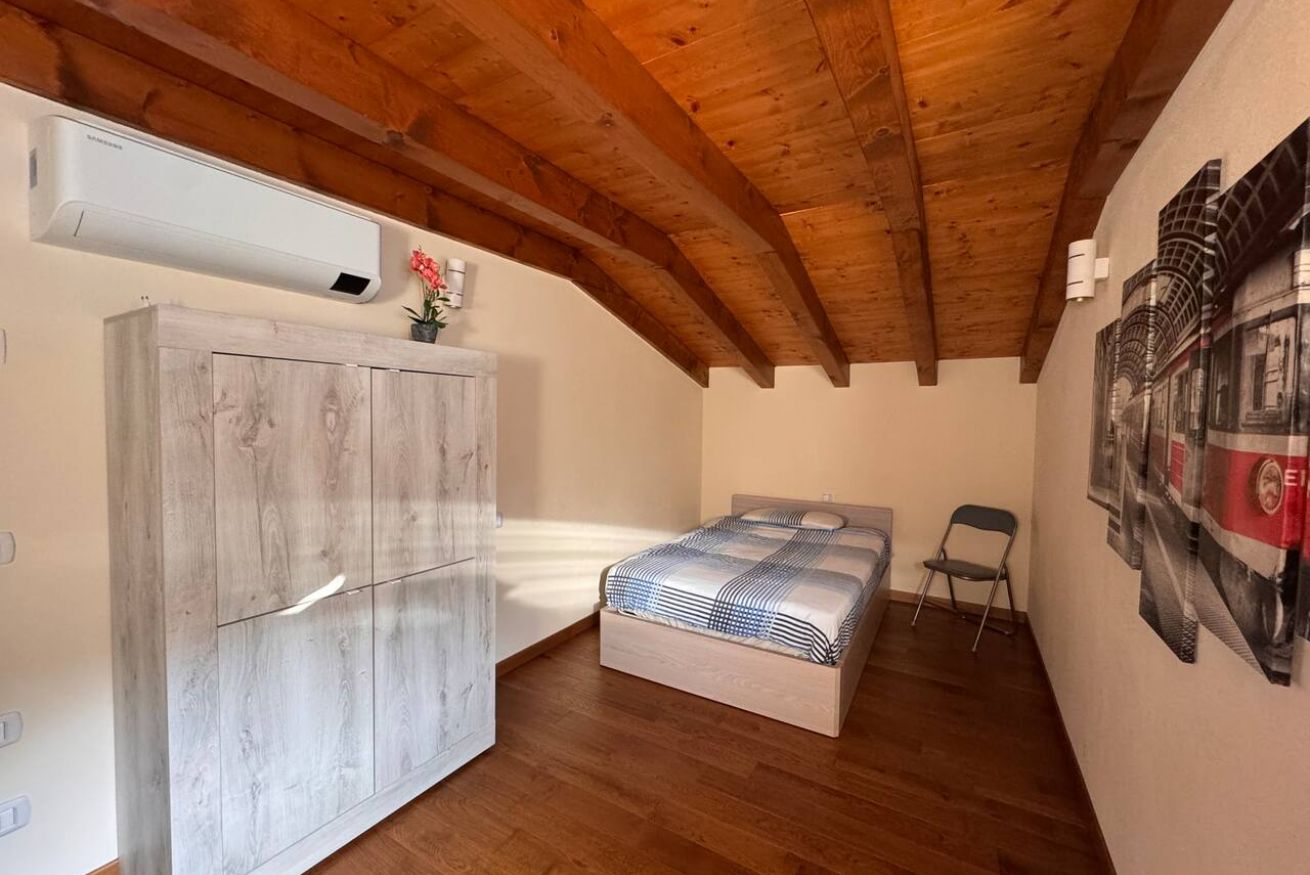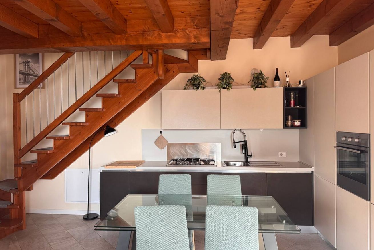 Al piano superiore, caratterizzato da calde travi in legno a vista, si trovano una seconda camera matrimoniale, una camera singola e un secondo bagno, creando una distribuzione ideale anche per famiglie o piccoli gruppi.