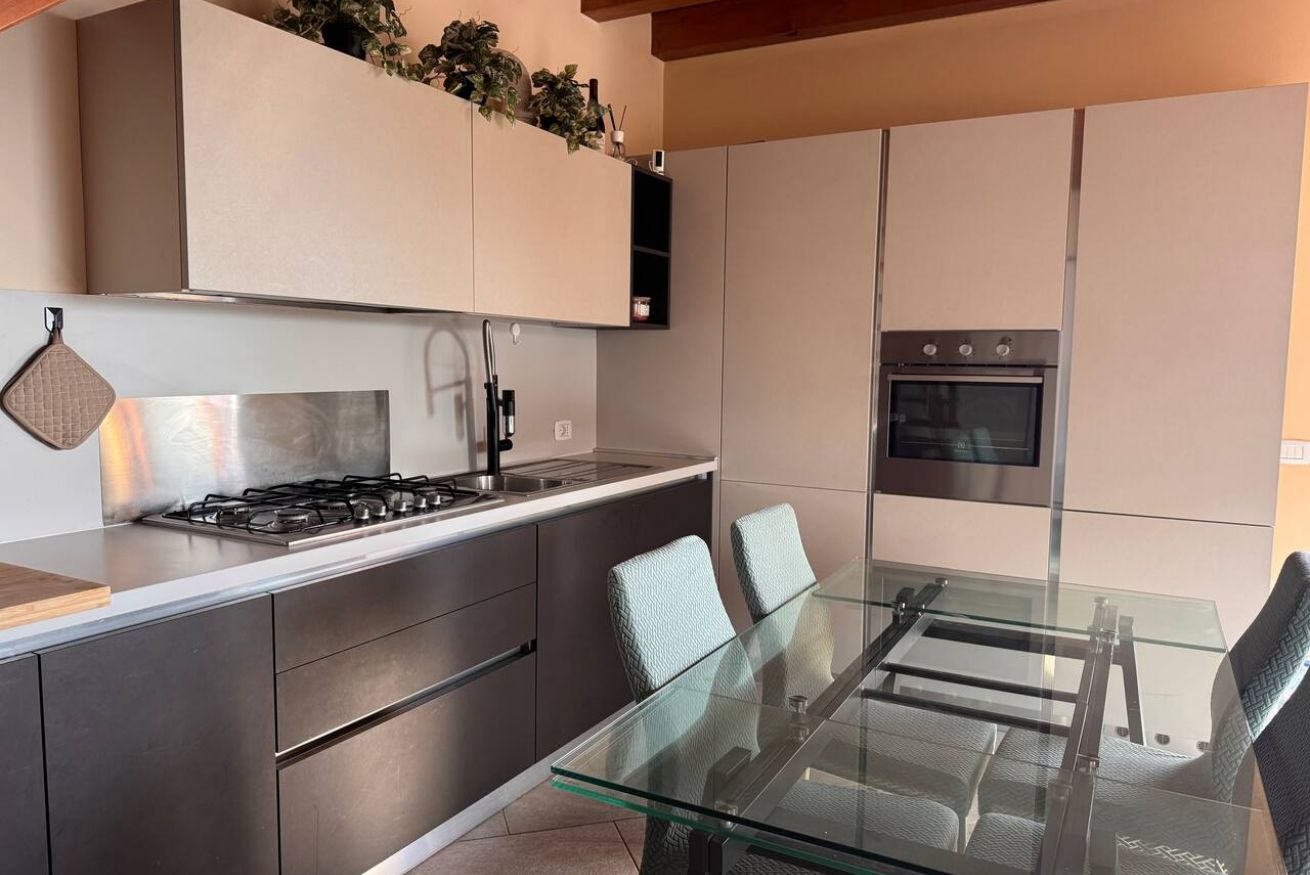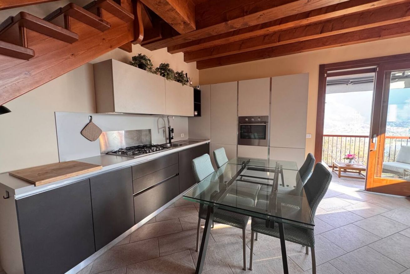 Al piano principale si trovano un soggiorno con cucina moderna completamente attrezzata, una camera matrimoniale, un bagno e l'accesso diretto al balcone panoramico, perfetto per colazioni all'aperto o momenti di relax con vista lago.
