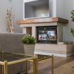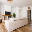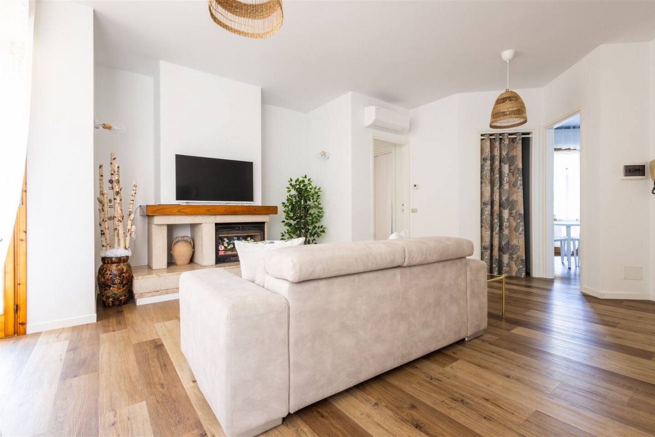 - Zona living luminosa con divano, caminetto e TV, perfetta per i momenti di relax