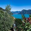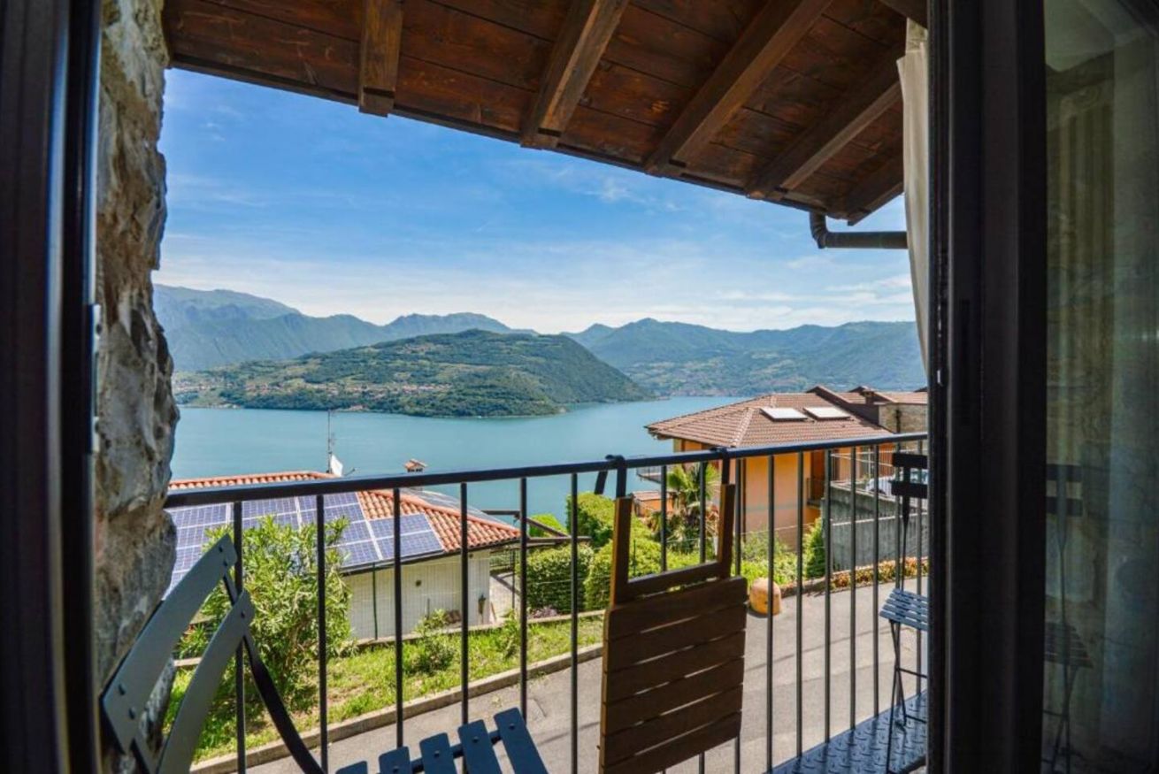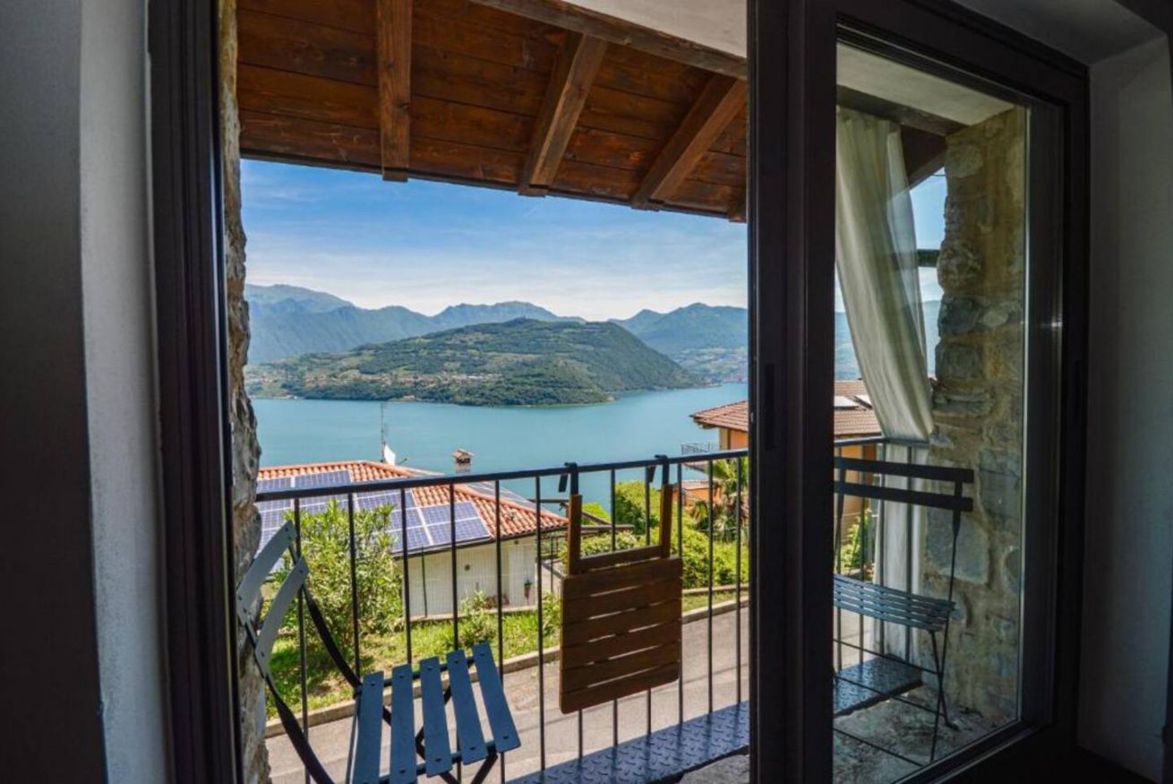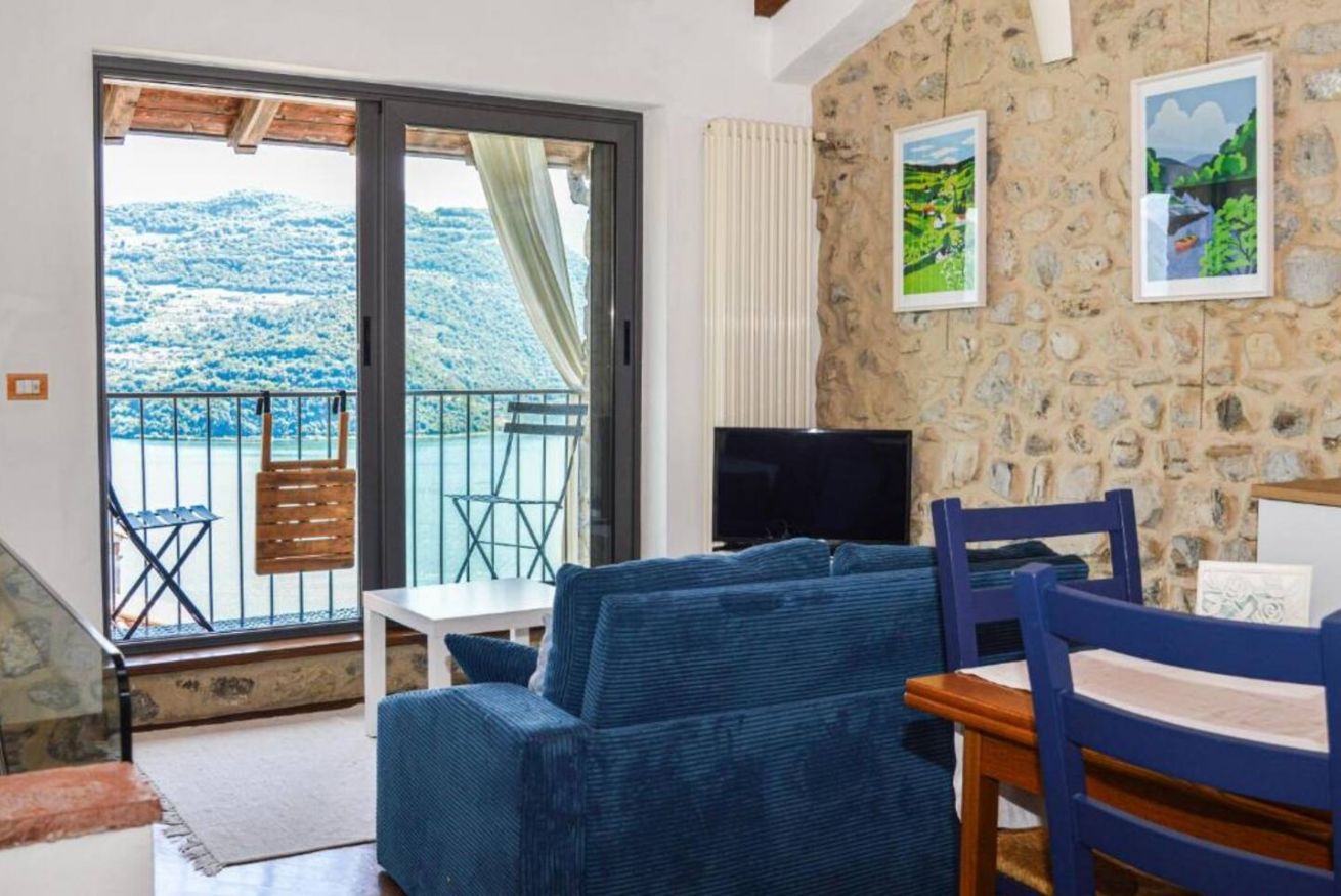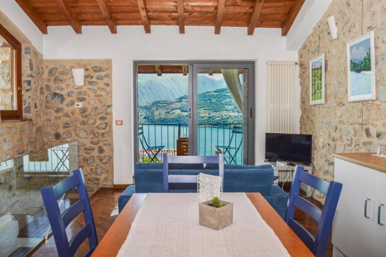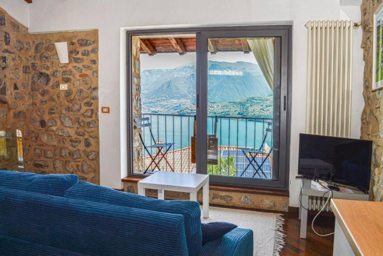 Il vero punto di forza della casa è la grande vetrata panoramica, che offre una vista mozzafiato sul lago e sulle montagne: una delle ante può essere completamente aperta, permettendo di vivere l'ambiente interno ed esterno in continuità. Addormentarsi e svegliarsi con questo panorama rende il soggiorno davvero speciale.