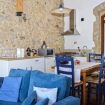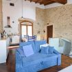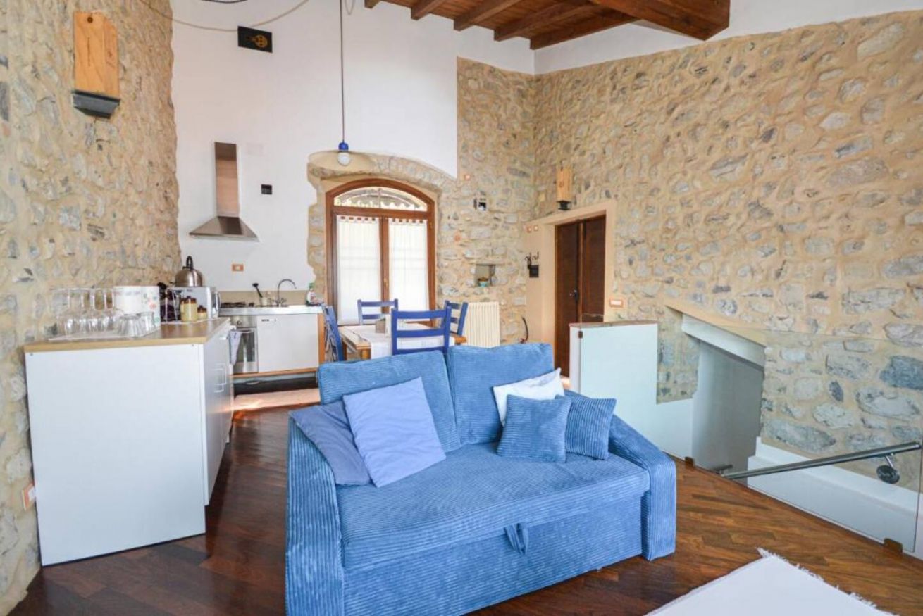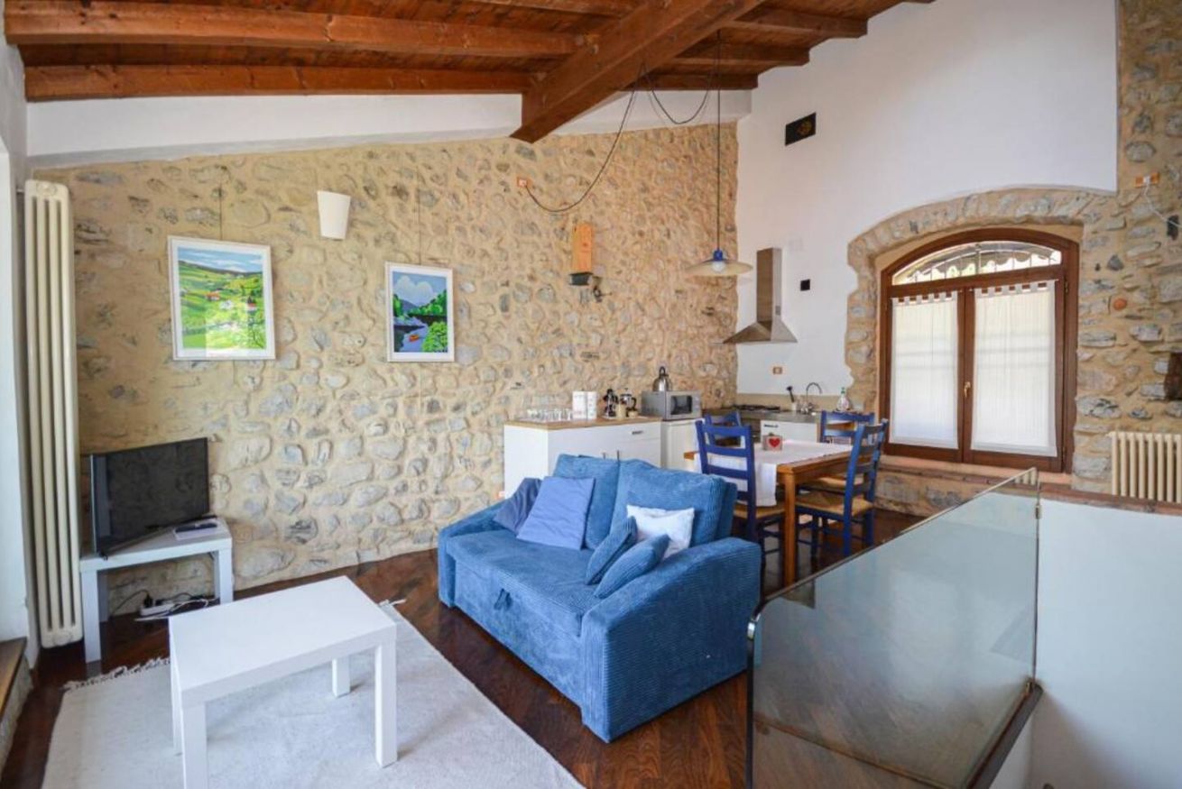 Il piano superiore ospita un angolo cottura completamente attrezzato e un soggiorno luminoso con divano letto (larghezza 112 cm) dotato di materasso a molle extra su misura, pensato per garantire un riposo confortevole anche agli ospiti aggiuntivi.