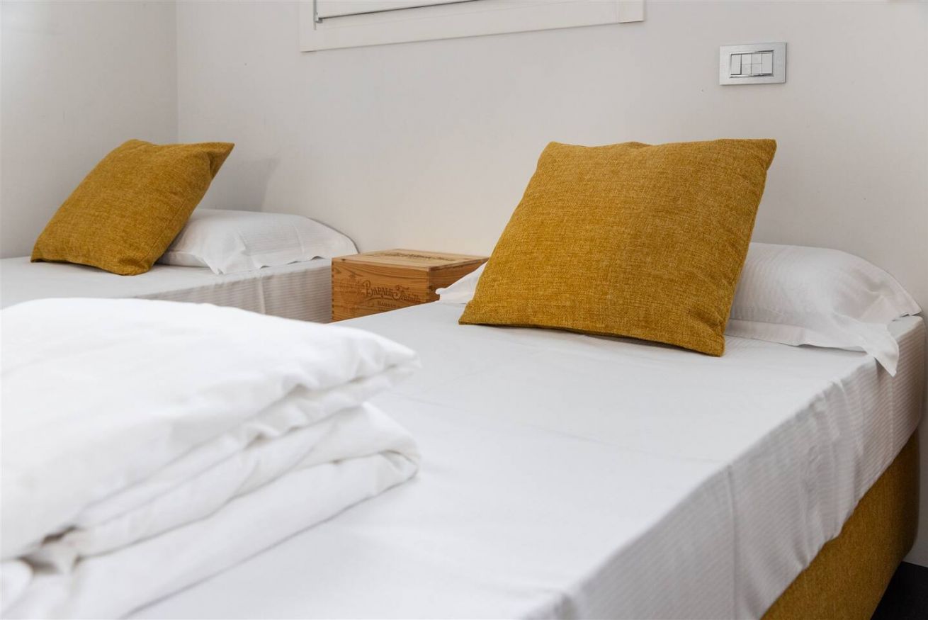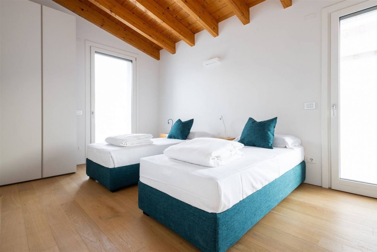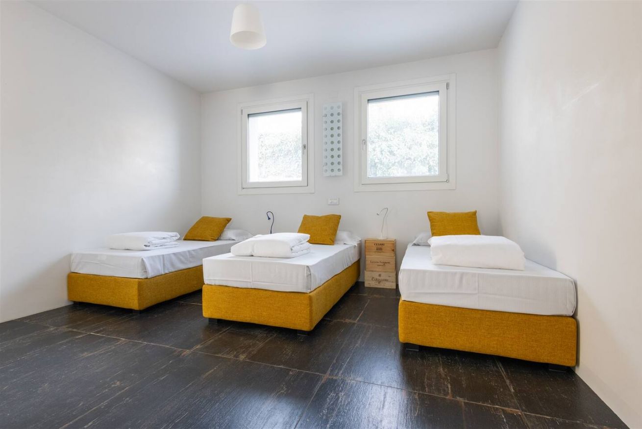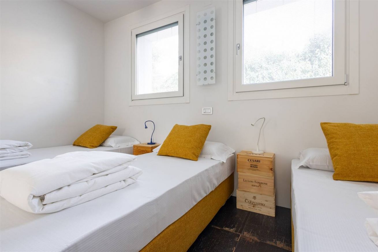 Al piano terra si apre una spaziosa zona living open space con cucina completamente attrezzata, collegata direttamente al patio coperto e al giardino privato. Sullo stesso livello si trovano una camera con tre letti singoli e un bagno.