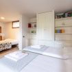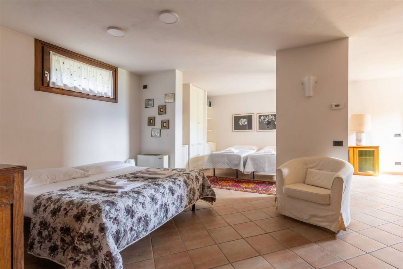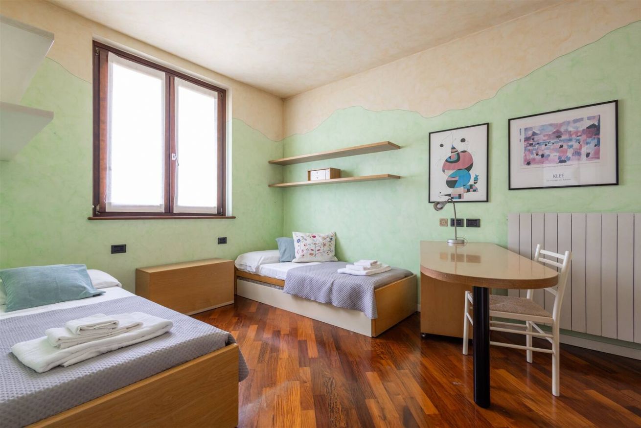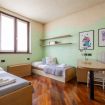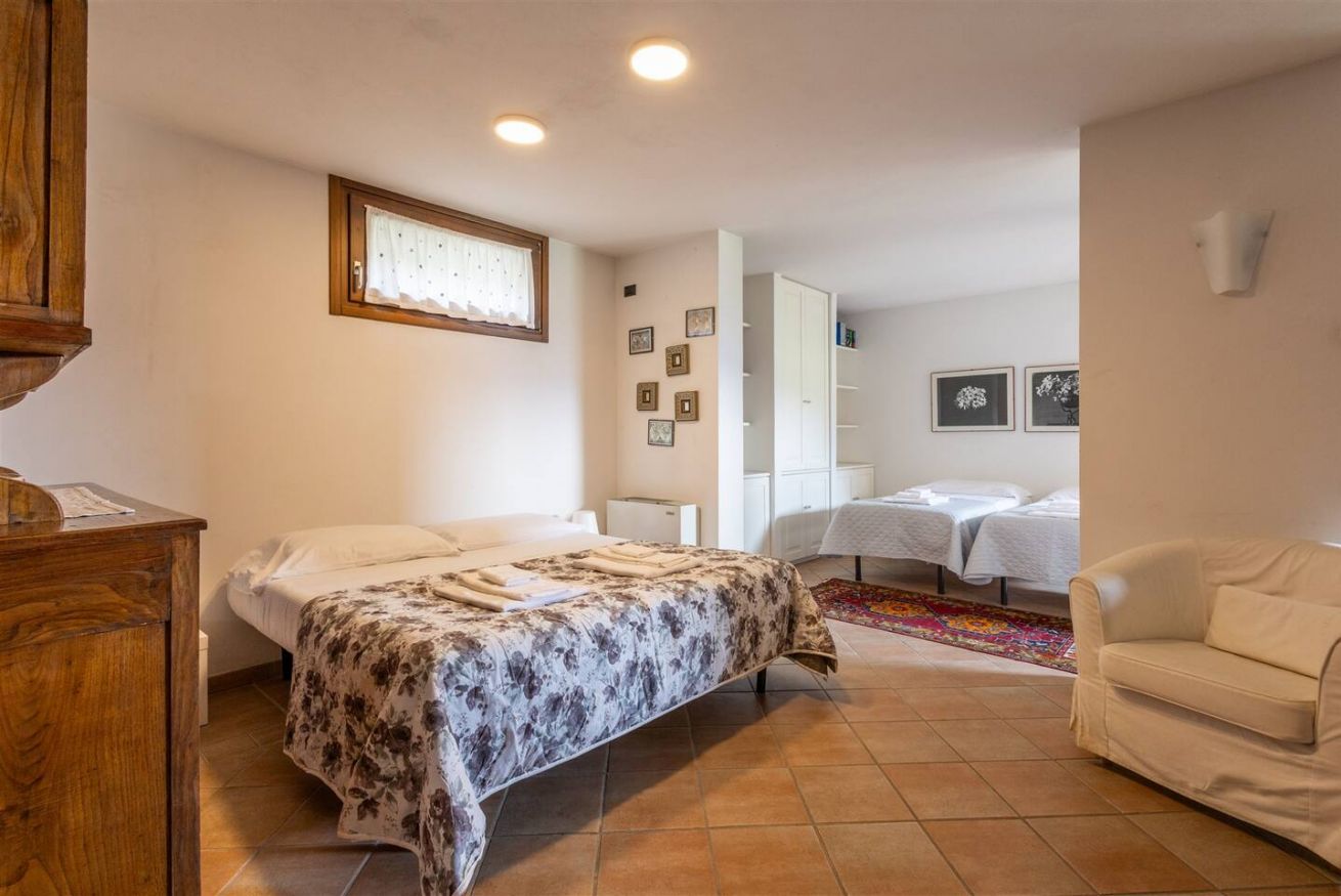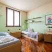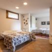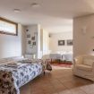 - Al piano terra una grande stanza open-space ospita un letto matrimoniale e due letti singoli, con un bagno dedicato.